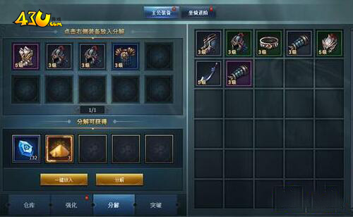 而且玩家们可以将自己用不上的装备进行分解,获得装备强化石。高品质的装备分解更有可能获得珍贵的装备精华,装备精华可用于商店中兑换紫装、橙装。