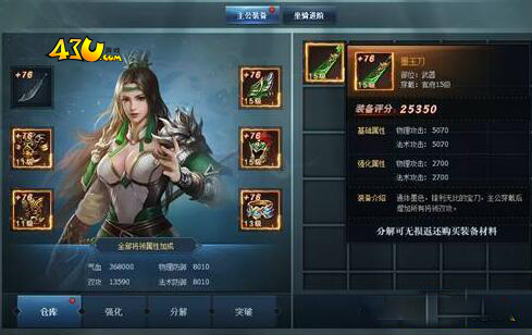 在游戏内,还可以将橙色品质的装备突破至超强的红色品质,大幅度提升装备属性。橙装突破需要消耗道具血晶石。红装还有额外的套装效果喔!.