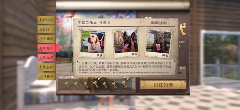 虚拟“工作犬”与现实“工作犬”的隔空对话游戏中,玩家们的狗狗也可以算作“工作犬”,为玩家的末日求生带来不少便利。而现实生活中,许多工作犬也早已在一些重要岗位上为人类奉献了多年。《明日之后》在本次的忠犬版本还与北京朝阳搜救犬站合作,让虚拟“工作犬”和现实“工作犬”交上了朋友,也让玩家通过寓教于乐的方式更多的了解到工作犬的价值。