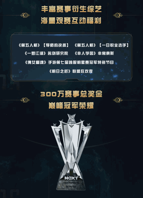 竞由自我,无以为界!网易电竞NeXT2020冬季赛今天正式拉开激战序幕,高手云集,群雄争霸,究竟是新秀崛起,还是王者归来?究竟谁能够笑傲巅峰!让我们共同期待,一起为热爱而战!