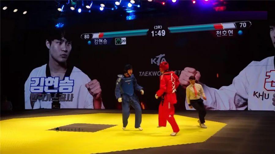 在今年年初的一场韩国跆拳道比赛场上,双方选手的「血量」和比赛时间都会显示在大屏幕上。会根据打击不同部位来扣除血量,即便是不懂跆拳道规则的观众也能看得懂。