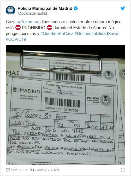 闷着难受,想出门溜达的西班牙民众不少借着遛狗的名义出门。有狗的宠物主可以遛狗外出,但宝可梦训练师们怎么办,对于训练师来说外出捕捉宝可梦也是必要的出门行为啊。什么时候宝可梦训练师才能得到同等对待,气抖冷。 许是反叛朋克精神不灭,又或是对宝可梦爱的深沉,77岁西班牙宝可梦训练大师决定铤而走险,出门捕捉宝可梦。 最后,这位77岁的《Pokemon Go》老玩家被警方逮捕,为了玩游戏也是蛮拼的。