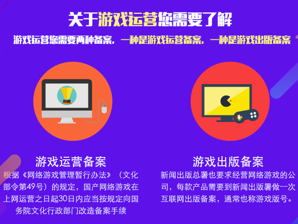 什么是游戏备案呢?千万别跟版号混为一谈,因为游戏备案的审批部门是“文化部”,所以大家也常叫做“文化部游戏备案”。此备案规定“国产游戏自上线运营之日起30日内报文化部备案”。