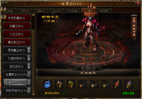 玩家达到55级,才能接触到个人boss的玩法。想了解攻铩经典版个人boss的信息,可以在世界boss列表里,找到个人boss的信息有页面。目前,攻铩经典版个人boss共有12只,分别有沃玛教主、逆魔、赤月恶魔、牛魔王、火龙王、魔龙教主、雪域魔王、九尾妖狐、巫妖王、虹魔教主、蛇蝎女王、阿修罗神。