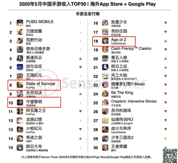 它们分别是龙创悦动的《守望黎明》,FunPlus的《State of Survival》和Camel Games(壳木游戏)的《Age of Z》。三者题材均为末日生存,核心玩法框架也都是cok-like,是典型的“细分题材+成熟玩法”组合套路。