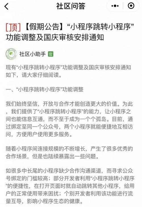 如很多中长尾的小程序缺少合作沟通渠道,而寻求公众号绑定的门槛较高;部分开发者利用“小程序跳转小程序”的便捷性,在打开页面时就自动跳转其他小程序,给用户的正常使用带来困扰;个别开发者利用该功能进行流量互导,影响小程序生态的健康。