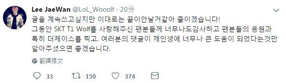 Wolf选手也是连续更新五条推特,长文回忆自己在SKT度过的时光,并向SKT正式告别。