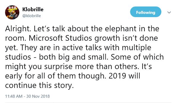 Klobrille表示微软正在与多家工作室商谈收购事宜,有大工作室也有小工作室。其中一些会让玩家感到惊喜。不过目前还处于比较初期的阶段,2019年将会有更多进展。他曾在十月底透露过开发了《求生之路》系列的Turtle Rock Studios与微软有过接洽,不过结果还不得而知。