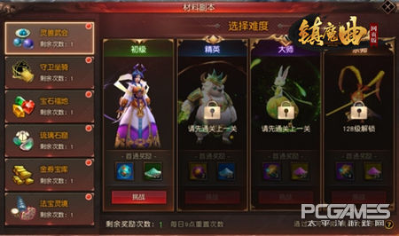 在《镇魔曲网页版》的材料副本中,每个分类的副本都有4个难度,越到后面,难度越高,同时奖励也越好。每类副本每天能领取一次奖励,而每个副本首次通关,则能够获得首通奖励,通关灵兽武会将能获得奖励灵兽经验药水和升阶道具。