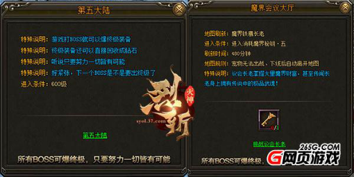 在第五大陆中,开放了全新的魔界会议大厅,玩家需要消耗魔界秘钥·五进入大厅。议会长老掌握大量魔界财富,甚至传闻长老身上拥有传说中的极品武魂,挑战议会长老有几率掉落极品武魂。