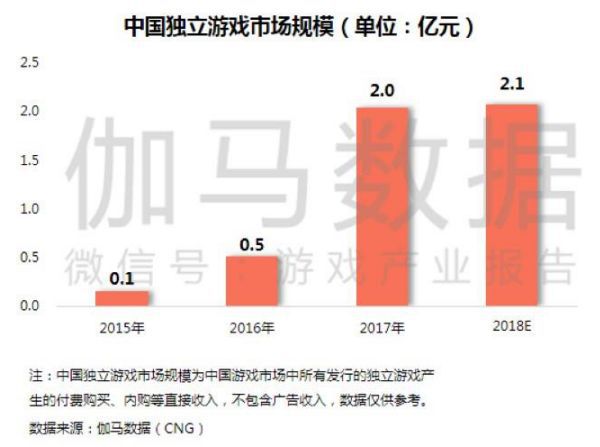 但和媒体们前呼后拥的欢呼所形成鲜明对比的是,国内独立游戏在营收方面却依然没有取得突破。伽马数据显示,2018年国内独立游戏市场规模将达到2.1亿,和2017年相比仅增长了1000万。