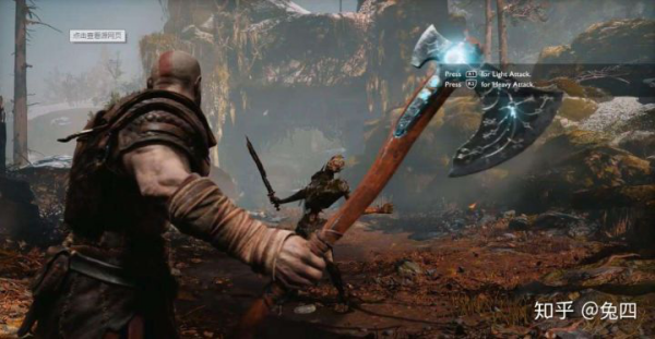 这把斧头的第一个惊艳之处在于,它是一把兼具近战和远程能力的武器。玩家既能够在近距离用斧头砍翻一切,也能够丢出斧头攻击远距离的敌人。在这个基础上,玩家在战斗中就有无数连招和搭配可以使用了,可以打远距离消耗、可以搭配拳头和盾牌进行连招、可以专门用冰冻来打控制等等。这也是为什么这一作《战神》从ACT转变成RPG之后,战斗一样酷炫无比的核心原因之一。