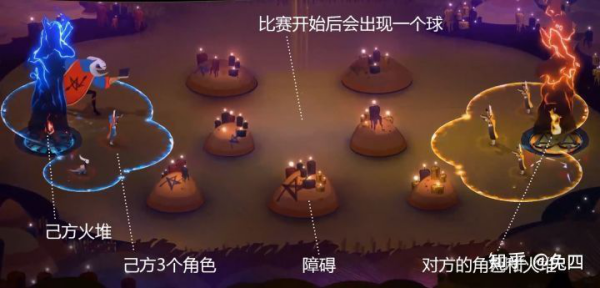 2、场地中间有一颗球,双方家里各有一个火堆