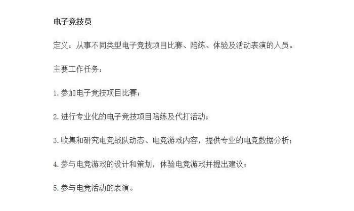 定义:从事不同类型电子竞技项目比赛、陪练、体验及活动表演的人员。