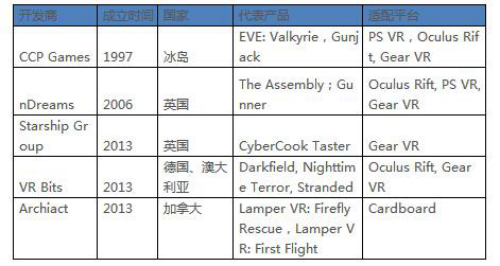 中国游戏厂商在VR游戏内容研发方面尚处于初期试水阶段,大中型上市游戏企业偏向于通过投资、合作、平台搭建的方式布局VR,而非直接参与内容研发。而目前已经曝光或推出的VR游戏产品也大多从手机或PC游戏移植而来,专门针对VR平台开发的游戏产品极少。
