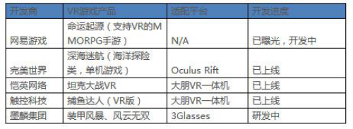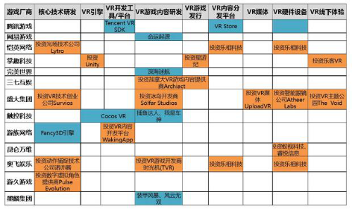 中国主要游戏厂商在VR游戏领域的布局