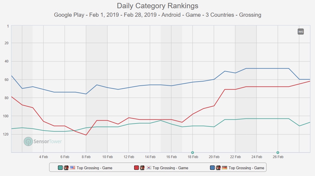 腾讯的另一款入榜游戏《Arena of Valor》(《王者荣耀》海外版)本月上升4名,位列18。PocketGamer援引日本野村证券信息称,在1月中旬发布2.0版本后,《王者荣耀》的2月单月流水超过了71亿元人民币(约10亿美元),且这一数据不包括第三方安卓商店。