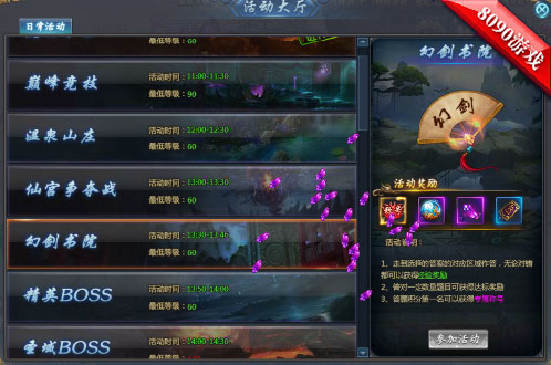 幻剑书院不同于其他的挑战,幻剑书院不需要你有任何的战力要求,只要玩家达到60级就可以参加,在每天的13:30-13:46,玩家可以通过点击活动按钮进入活动。