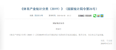 4月9日,国家统计局正式发布了《体育产业统计分类(2019)》。