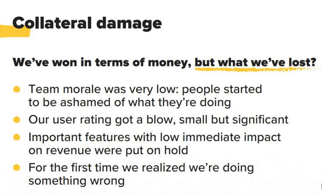 Krasilnikov总结说,“我们学到的教训是,游戏里的每一个功能都要从长远考虑来做,要把它做成可以维持1-3年的玩法。而且,不要低估你的玩家社区对研发团队士气的影响力,如果玩家不开心,你的团队成员也会受到影响。但总的来说,不可控制的爆发式增长并不是好事,它会对你的工作室和游戏带来负面影响”。