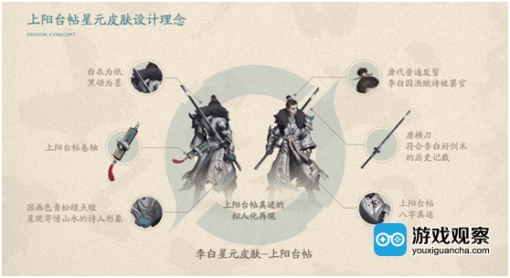 从游戏原画和游戏内表现来看,这款李白《上阳台帖》免费星元皮肤是用黑白色调的水墨风渲染而成,以国画色青松绿作为点缀,再搭配唐横刀、书法卷轴、八字真迹等细节元素,将《上阳台帖》拟人化再现,勾勒出了一个寄情于山水的诗人形象;并且专属动作会伴随着英雄的语音,再现《上阳台帖》真迹的四言诗全篇,让玩家切真体会到李白的笔墨挥洒,感受“诗仙”的畅意书写。目前,主题站也已经解锁了“书法传承设计”主题纪录片,为我们展现了这款皮肤诞生背后的故事。