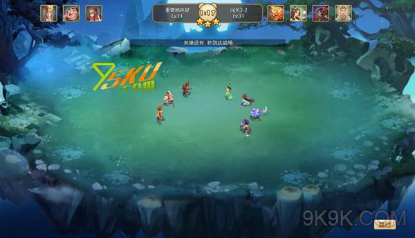 遭遇战场景比较简单,画面上方,两侧分别显示双方的英雄,中间显示战斗倒计时的剩余时间。画面中间的空地是英雄们的战斗区域。