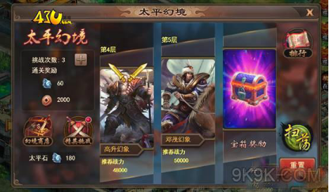 太平幻境每日拥有1次免费重置关卡次数,可将所有关卡重置为未挑战状态,重置之后需从第一层开始挑战,并正常获得挑战奖励。