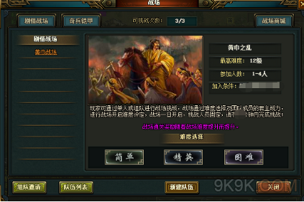 玩家进入《热血三国》游戏中,一共有3个等级的战场可以选择:简单、精英及困难。玩家还可以根据自身情况来选择战场难度,等级越高难度也就越大。由于每位君王和将领的体力有限,更别说打战的士兵,系统设定了每位君主每天只能进行5场战役。如果玩家独自一人无法同通关战场可邀请其他玩家一起,每场最多可参与4名玩家。
