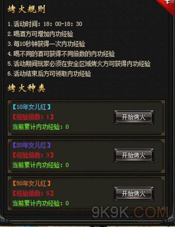 活动需要我们烤火,点击开始烤火,在篝火附近,每隔10秒就能获得一次内功经验,花费元宝喝更好倍数的就可以活动更高的内功经验。
