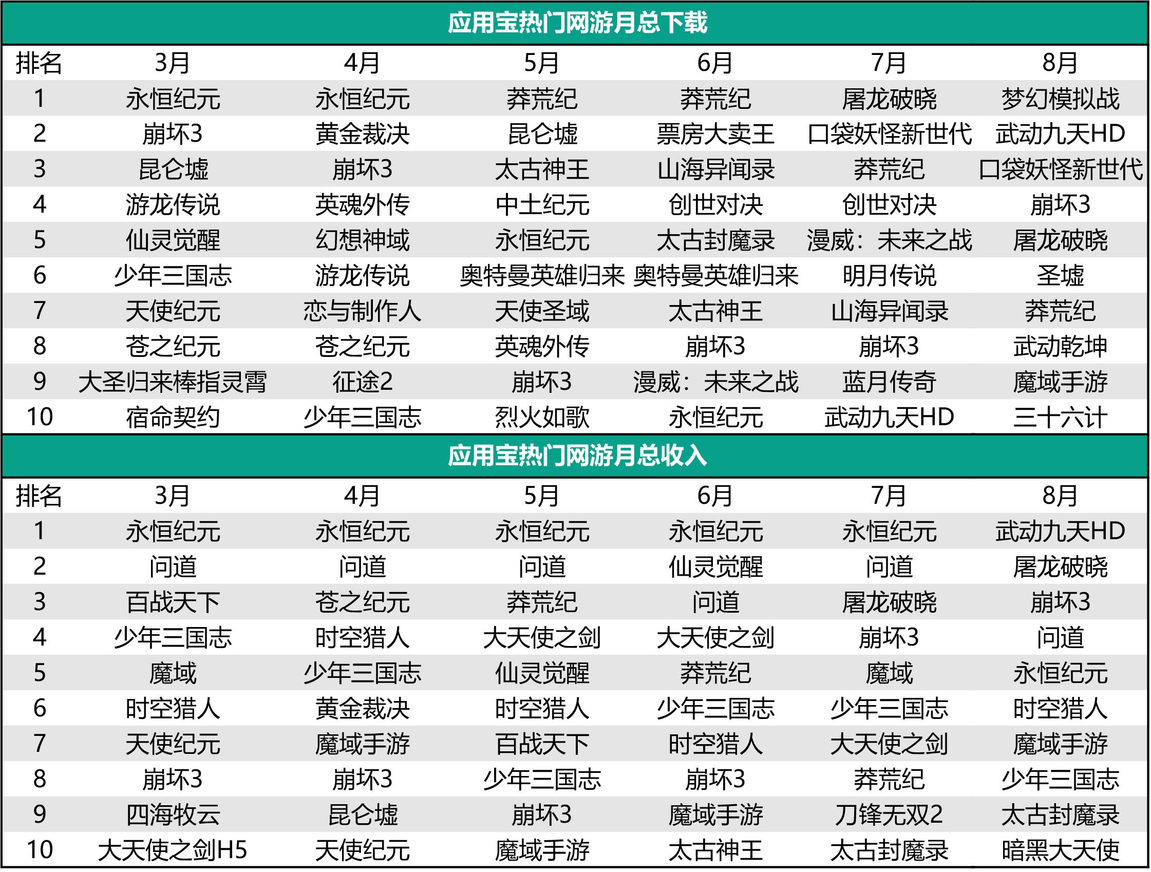 此外,缺少新产品的冲击,应用宝、OPPO、vivo等硬核联盟渠道榜单也逐渐固化。根据应用宝官方发布的月度手游报告,从3月到8月,热门网游总下载TOP10中突围的新品占少数,包括《永恒纪元》、《崩坏3》、《少年三国志》等在列的都是老产品。此外,每月热门网游总收入的TOP10产品固化更加明显,《永恒纪元》、《问道》、《崩坏3》、《时空猎人》、《少年三国志》等运营时间长达数年的产品都是常客。