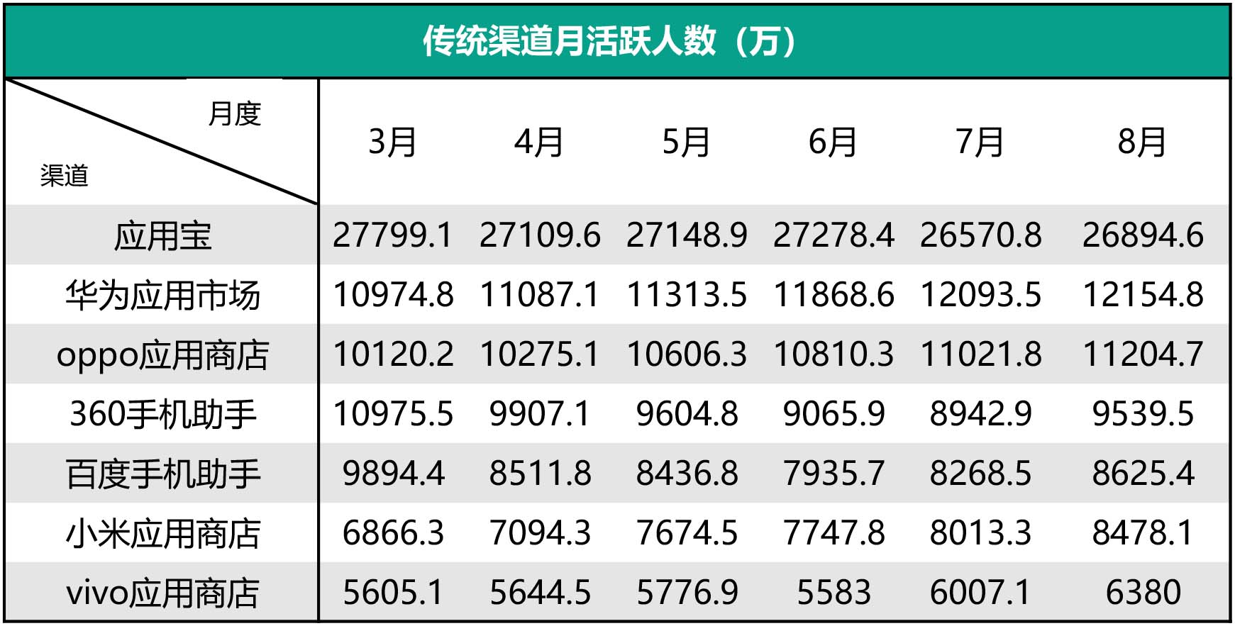 这也反映在各渠道的月活跃用户数走向上。手游那点事结合第三方发布的相关数据,今年3月份到8月份期间,应用宝MAU从2.78亿下滑至2.69亿,360手机助手以及百度手机助手均呈下滑趋势,仅在暑假的7月及8月有短暂上升。