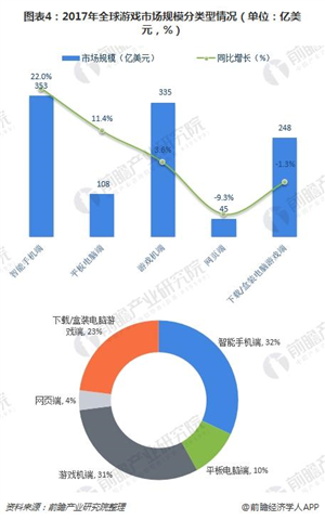 分类型来看,得益于竞技类和沉浸式手游的发展、越来越多的智能手机用户以及日渐改善的移动基础设施和硬件,移动游戏市场发展迅猛,2017年市场规模达到461亿美元。其中,智能手机端游戏市场规模为353亿美元,占总的市场规模比重为32%,较上年提高了4个百分点;平板电脑端游戏市场规模为108亿美元,同比增长11.4%,占比10%。