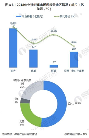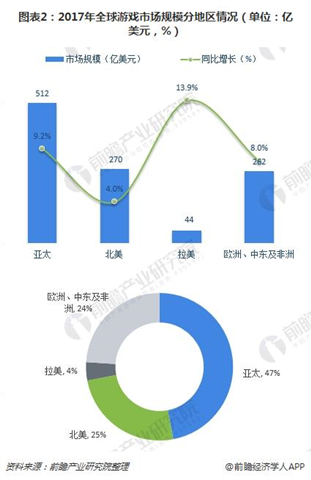 2018年,全球游戏市场规模预计将达到1379亿美元,同比增长13.3%。其中,受益于印度及东南亚新兴市场的兴起,亚太地区今年将创造714亿美元的游戏收入,占全球总市场收入的51.8%,同比增长16.8%;北美作为成熟市场,也将保持10.0%增速,市场规模或达327亿美元。