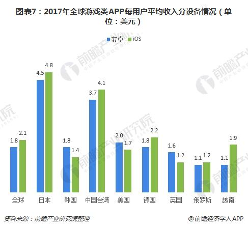 从设备来看,iOS端游戏类APP要高于安卓端。数据显示,2017年,全球iOS端游戏类APP每用户平均收入达到2.1美元,而安卓端每用户平均收入1.8美元。尽管苹果用户群体较富裕,随着安卓端不断增加的用户数,安卓端收入增速同样较快,不容小视。2017年,韩国、美国、英国安卓端每用户平均收入便已超过iOS端。