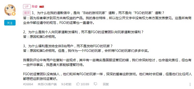 像FGO官博已经透露不参与9周年福利发放,是版权方不让,玩家却怀疑你准备关服跑路,“全家开生日宴,赚钱养家的大女儿被拒之门外”的段子给你安排的明明白白;董事长陈睿低姿态出来发补偿,还被骂成是挑拨B站用户和FGO玩家对立。如今的游戏公司面对玩家,真的是哑巴吃黄连,有苦说不出。