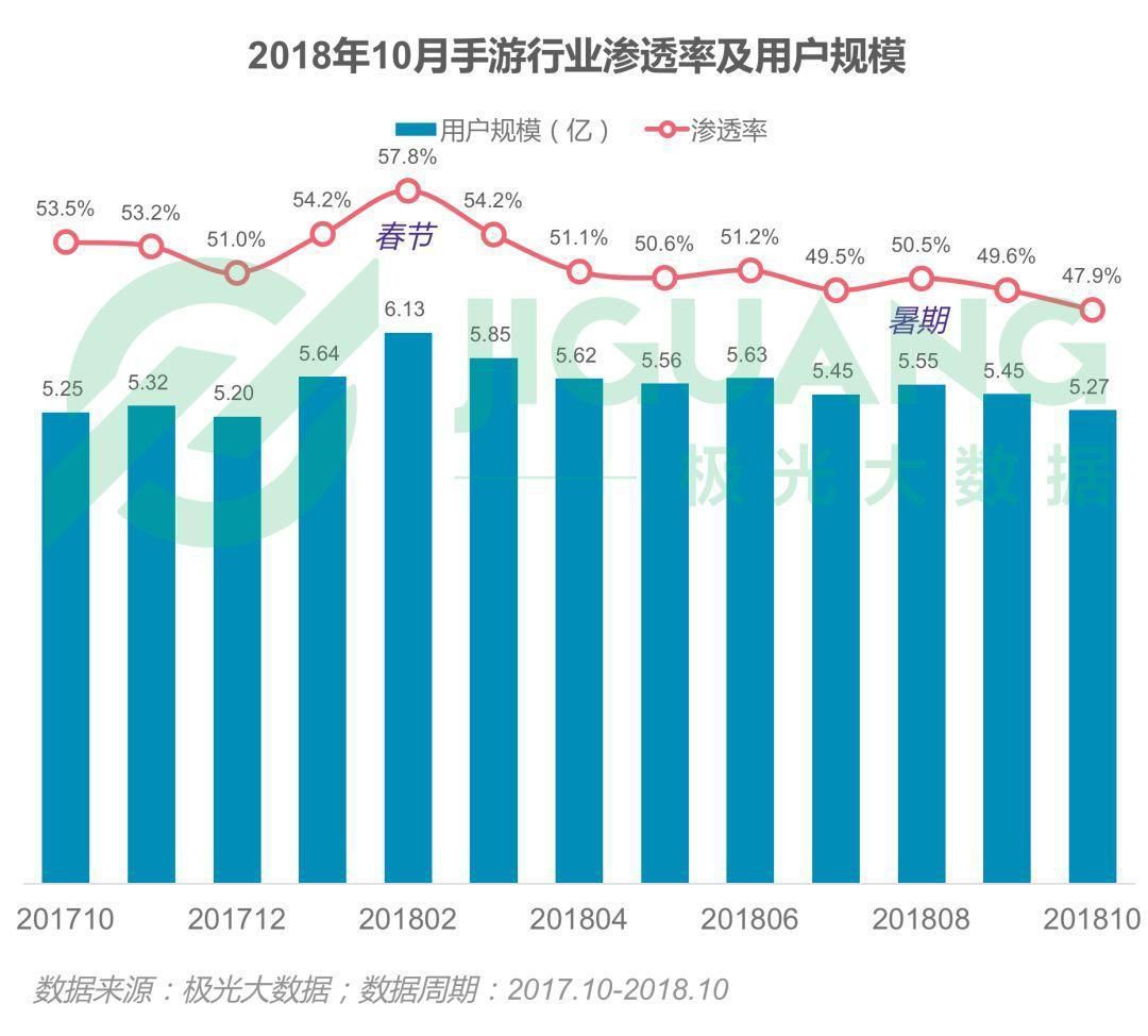 产品荒不难理解,流量荒和用户荒也是行业大势。据极光大数据统计,过去一年中,手游行业整体渗透率和用户规模都出现了较为明显的波动。从2月份春节57.8%的高点开始,行业渗透率一路下降,10月份时已到47.9%。用户规模则是从6.13亿下降至5.27亿。