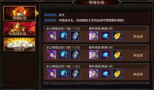 除了常规的等级礼包外,在开服时也可额外增加限时的等级礼包,一定时间内达成等级获得额外奖励,使用户在刚玩游戏的时候有紧迫感,增加用户粘性。