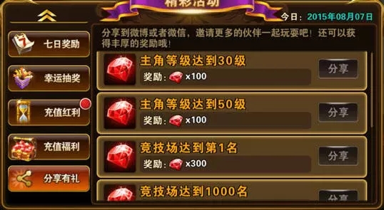 通过分享在游戏内获得的成就等,获得钻石或游戏内其他资源奖励。
