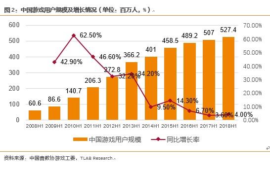 在游戏用户规模方面,根据中国音数协游戏工委(GPC)的数据,2018年1-6月中国游戏用户规模为5.3亿人,同比增长仅4.0%。事实上,从2010年起,中国游戏用户规模的增长就逐渐放缓,从2010年上半年的62.5%逐渐降低至2018年上半年的4%,表明游戏市场趋于饱和,人口红利逐渐消失。另一方面,今年下半年中国音数协游戏工委公布的数据显示,2018年游戏用户的整年增长率达到了7%。半年时间增长率由4%提高到7%,其主要原因是在《英雄联盟》S8世界总决赛中,中国的IG战队战胜欧洲的FNC夺得世界冠军,创造了中国电竞的历史,《人民日报》等主流媒体也纷纷给予正面报道,这带动了游戏用户的增长。