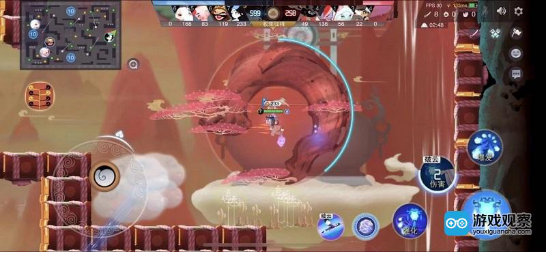 笔者认为丰富的场景变量元素是游戏打出创新与差异化的关键点。首先,在《闹闹天宫》之中分布有四棵蟠桃树,初始状态为双方各两棵,可以在竞技过程中相互占领。蟠桃树的主要作用是“产桃”及“复活点”——每过一段时间蟠桃树就会产出大量蟠桃供摘取,玩家死后将在最近的蟠桃树复活