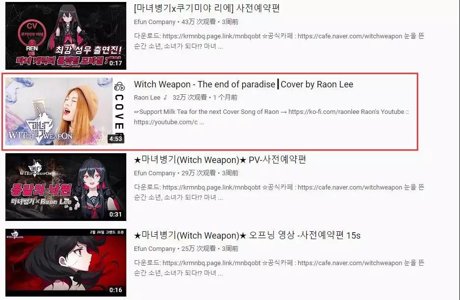 Efun的《魔女兵器》在韩国市场上线之前,邀请了韩国本土在动漫游戏领域的达人YouTuber、人气“唱见”Raon Lee为游戏的OST献声,在YouTube上获得了相当不错的曝光量。