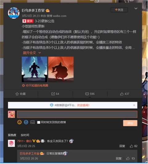 这其中还发生了一件趣事,《刀塔自走棋》玩家在贴吧中发表生日许愿帖,希望某位新英雄登场,随后在最近的更新中,巨鸟多多官方更新通告就预告即将上线该英雄。虽然看上去有一些运气的成分,但并不妨碍众多粉丝在这个帖子下盖楼,形成了能分享好运气的“许愿池”。