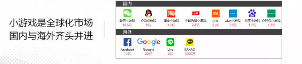 比如,自去年12月28号上线的微信小游戏平台上线,在国内表现就十分突出。在海外,以Google、Facebook、Line为代表的社交类应用,大部分也已建立或者正在建立自身的小游戏平台。