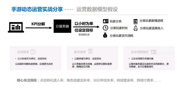 对于数据模型的假设,我们对游戏行业的KPI拆分为两个板块:一是在产品未上线前的收入预测。二是在上线后的商业化测试中去修订之前预测的数值。即便在上线首月,KPI的数据也都是“天”为单位的,这种数据模型在我看来是粗糙的。至少,上线首月必须以“小时”来切割目标。当然,万事开头难,你需要建立模型的过程。一开始可能只是一个预判值,但是基于这个预判的数字,运营在实际上线看到用户的反馈和验证之后,以小时为单位去实时观测并修正这个数字。这种行为可以在商业化测试阶段的P2阶段就开始执行,只有把颗粒度切得足够细,才能迅速警醒,从而做出反应。另外,建议以服务器为单位,每一个服务器作为单独的一个单位来计量,每个服务器的生态不同,因此统合来看便不能及时发现问题。服务器有生命周期,玩家也有生命周期。当有的玩家并没有走完生命周期就卸载了游戏,这个时候就有可能是服务器或是游戏机制等方面的问题。这时细分后台数据便可以得到很多更用户对游戏的反馈和生态的表现,带来一些不一样的启发和警示。