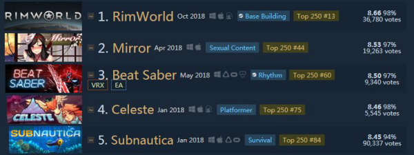 比如Steam上好评率最高的那堆游戏,很多都不是质量吹爆、拿奖拿到手软的游戏。有个第三方统计网站叫Steam Top 250,是效仿电影评分网站IMDb建立的。这个网站统计了去年新晋的Top250榜单,第二名是知名三消黄油《Mirror》。