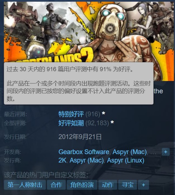 《无主之地2》的近30天评测曾一度低到了“褒贬不一”,但现在已经恢复到了“好评如潮”