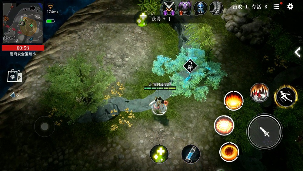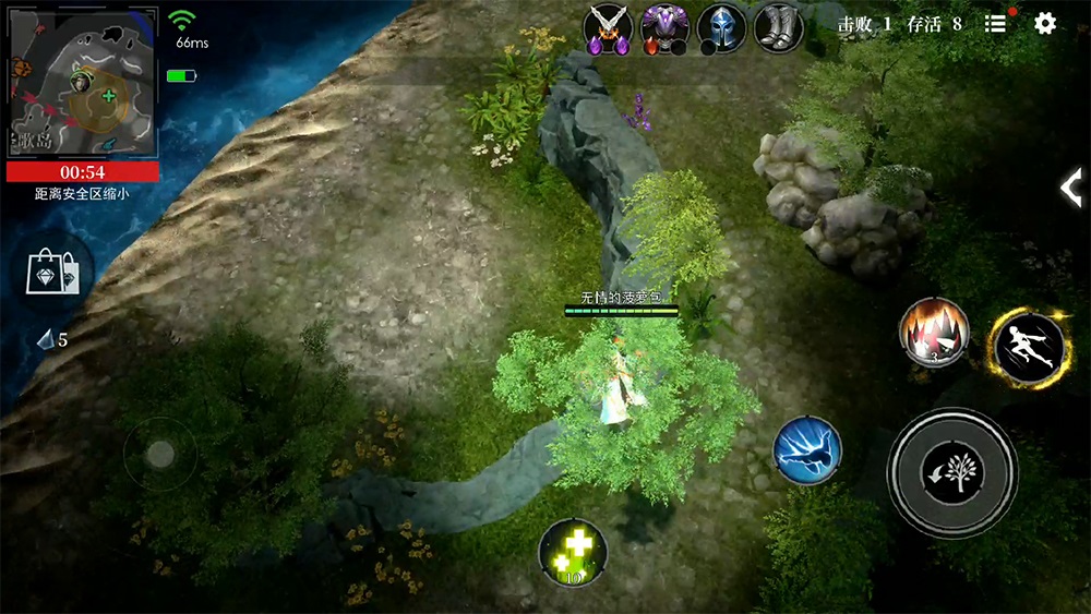 当地形高度成为策略的关键要素后,游戏相应加入了跳树和沙盒拟态技能。如果周围没有较高的地形或者建筑,玩家可以通过跳到树上,或者短暂地变成一只鸟,以获取更大范围的视野,从而转移或者偷袭其他玩家。