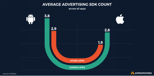 为进行广告变现,两个平台的应用接入广告 SDK 的数量也有所不同,首先可以看到一般情况下 App 都会接入多个广告 SDK,平均数量为每个 App 2.7 个。无论是游戏还是非游戏,安卓应用接入的广告 SDK 都更多。