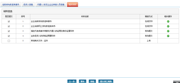 页面下方有四个按钮,可进行信息上一步、暂存、校验、提交工商局等四种操作。