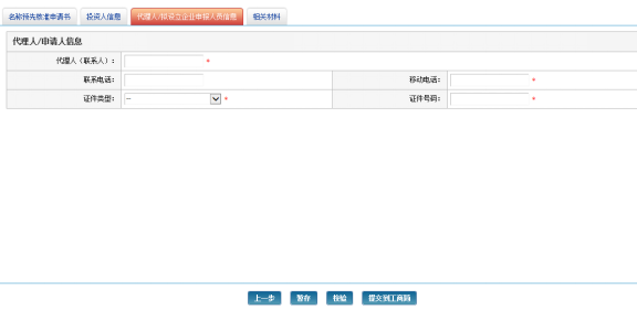 在“代理人/拟设立企业申报人员信息”标签页中,输入代理人/申请人信息。